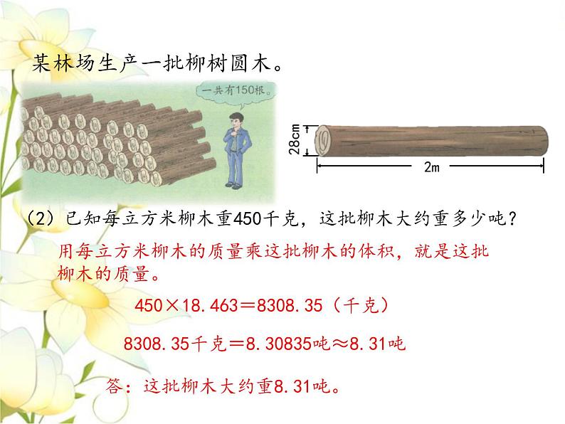 (2)已知每立方米柳木重450千克,这批柳木大约重多少吨?