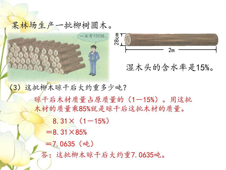 晾干后木材质量占原质量的(1-15%)。用这批木材的质量乘85%就是晾干后这批木材的质量。