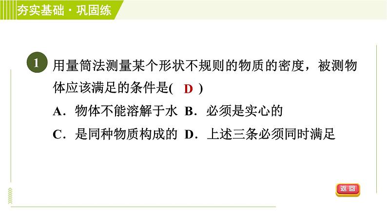 展开用量筒法测量某个形状不规则的物质的密度,被测物体应该满足的条件是( )A.物体不能溶解于水 B.必须是实心的C.是同种物质构成的 D.上述三条必须同时满足