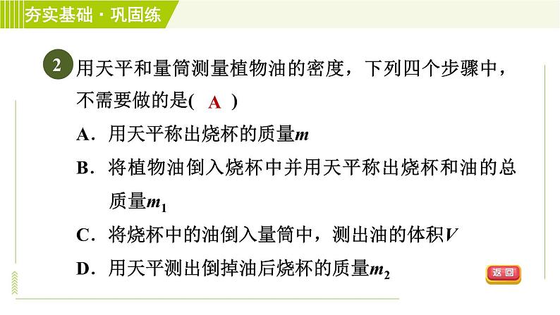用天平和量筒测量植物油的密度,下列四个步骤中,不需要做的是( )A.用天平称出烧杯的质量mB.将植物油倒入烧杯中并用天平称出烧杯和油的总质量m1C.将烧杯中的油倒入量筒中,测出油的体积VD.用天平测出倒掉油后烧杯的质量m2