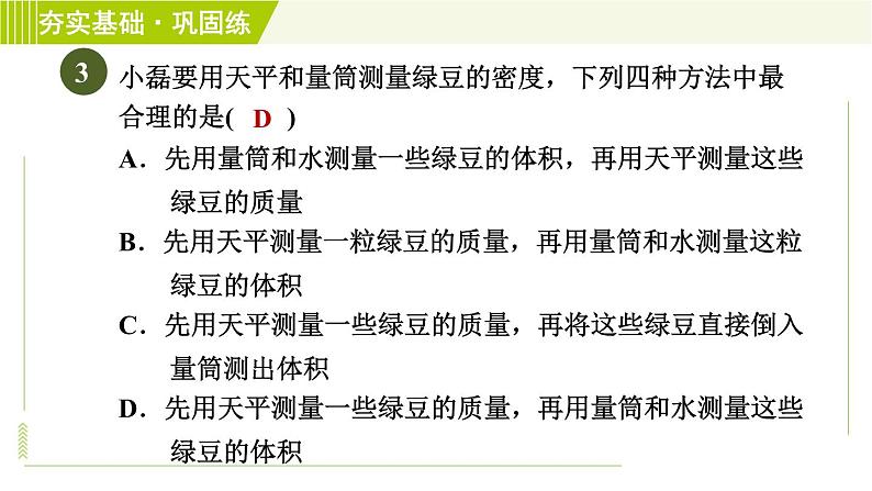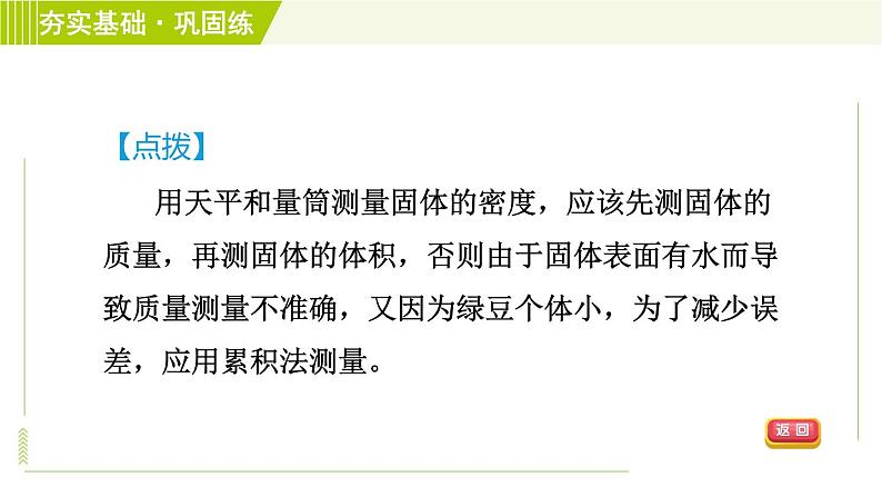 【点拨】用天平和量筒测量固体的密度,应该先测固体的质量,再测固体的体积,否则由于固体表面有水而导致质量测量不准确,又因为绿豆个体小,为了减少误差,应用累积法测量。