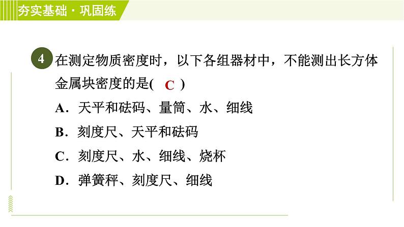 【点拨】测长方体金属块密度,测质量可以用天平或弹簧秤,测体积可以用量筒和水或者刻度尺。