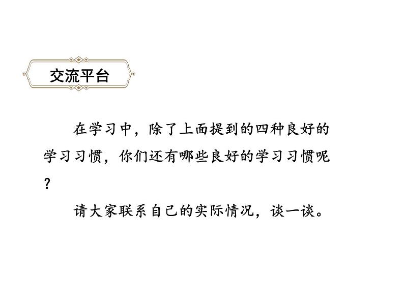 在学习中,除了上面提到的四种良好的学习习惯,你们还有哪些良好的学习习惯呢? 请大家联系自己的实际情况,谈一谈。