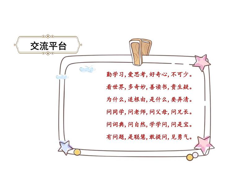 勤学习,爱思考,好奇心,不可少。看世界,多奇妙,善读书,贵生疑。为什么,追根由,是什么,要弄清。问同学,问老师,问父母,问兄长。问词典,问自然,学学问,问是宝。有问题,是聪慧,敢提问,见勇气。