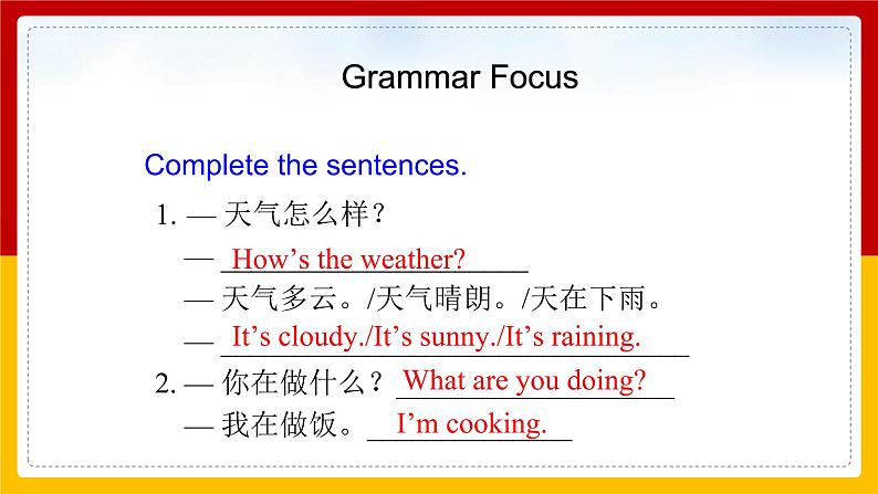 1. T talk abut the weather: —Hw’s the weather? —It’s cludy./It’s sunny./It’s raining.2. T learn the present prgressive tense: What questins —What are yu ding? —I’m ding my hmewrk. —What’s Jhn ding right nw? —He is playing sccer. —What are Julie and Jane ding? —They’re making sup.
