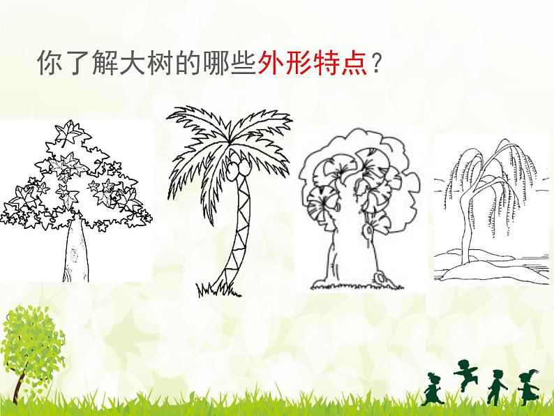 作业: 大家发挥想象力,画一张有趣的关于大树故事的画吧!要求: 1.表现出大树外形的特点 2.体现出大小对比关系 3.画面饱满、美观 4.故事生动有趣