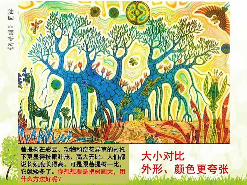 菩提树在彩云、动物和奇花异草的衬托下更显得枝繁叶茂、高大无比。人们都说长颈鹿长得高,可是跟菩提树一比,它就矮多了。你想想要是把树画大,用什么方法好呢?