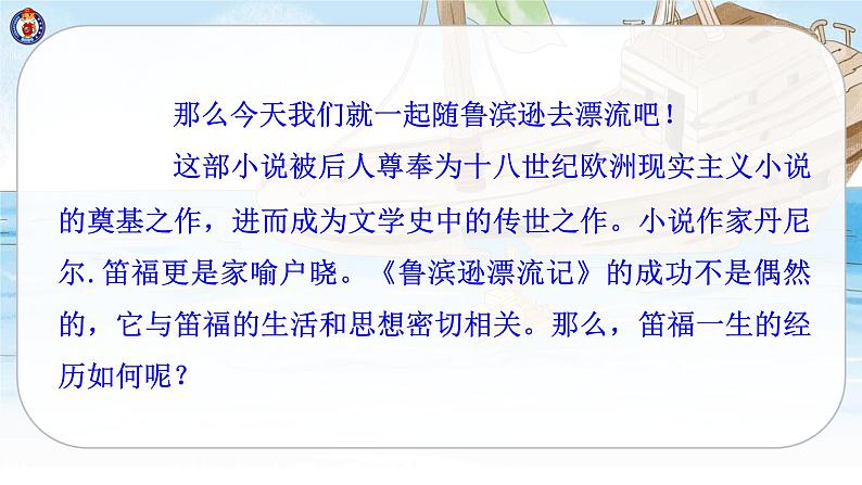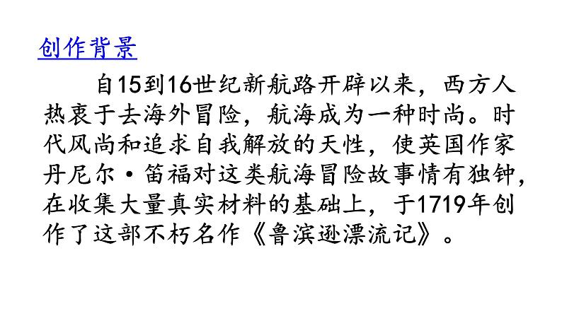 这是一份小学语文人教部编版六年级下册第二单元5 鲁滨逊漂流记(节选)授课ppt课件,文件包含5鲁滨逊漂流记第一课时课件ppt、5鲁滨逊漂流记第一课时练习doc、5鲁滨逊漂流记第一课时教案doc等3份课件配套教学资源,其中PPT共18页, 欢迎下载使用。