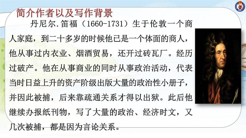 丹尼尔.笛福(1660-1731)生于伦敦一个商人家庭,到二十多岁的时候他已是一个体面的商人,他从事过内衣业、烟酒贸易,还开过砖瓦厂。经历过破产。他在从事商业的同时从事政治活动,代表当时日益上升的资产阶级出版大量的政治性小册子,并因此被捕,后来靠疏通关系才得以出狱。此后他继续办报纸刊物,写了大量的政治、经济时文,又几次被捕,都是因为言论关系。