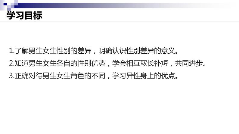 1.了解男生女生性别的差异,明确认识性别差异的意义。2.知道男生女生各自的性别优势,学会相互取长补短,共同进步。3.正确对待男生女生角色的不同,学习异性身上的优点。