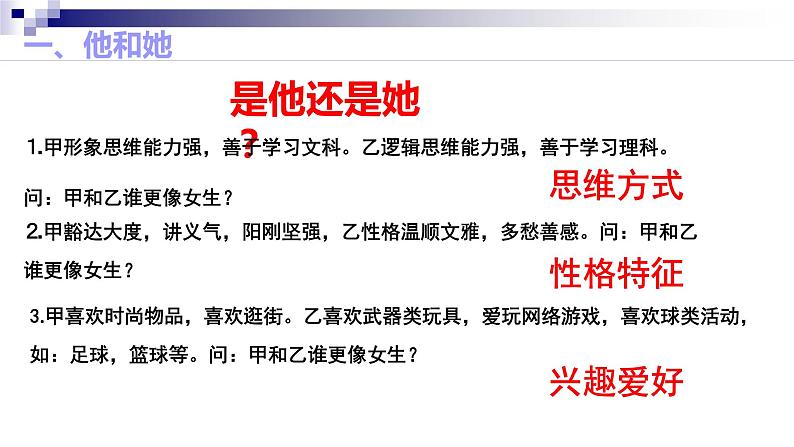⒈甲形象思维能力强,善于学习文科。乙逻辑思维能力强,善于学习理科。问:甲和乙谁更像女生?