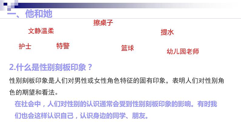 (1)积极作用:可以帮助我们了解自己与异性的不同特点,学会如何塑造自我形象,如何与异性相处。(2)消极作用:性别刻板印象也可能在某种程度上影响我们自身潜能的发挥。我们在接受自己生理性别的同时,不要过于受性别刻板印象的影响。