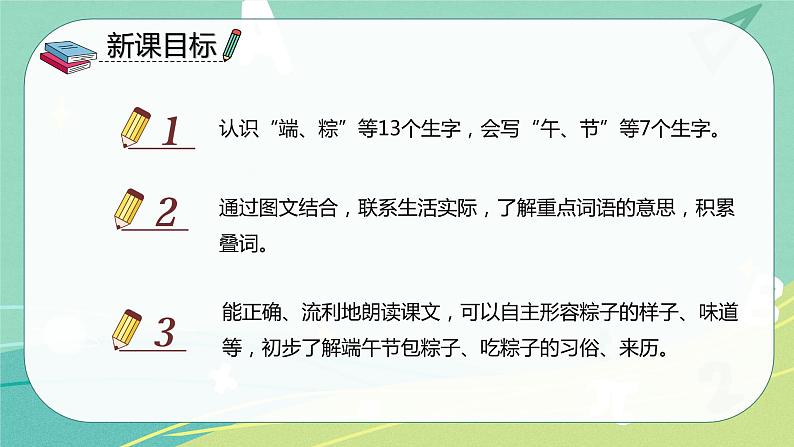 能正确、流利地朗读课文,可以自主形容粽子的样子、味道等,初步了解端午节包粽子、吃粽子的习俗、来历。