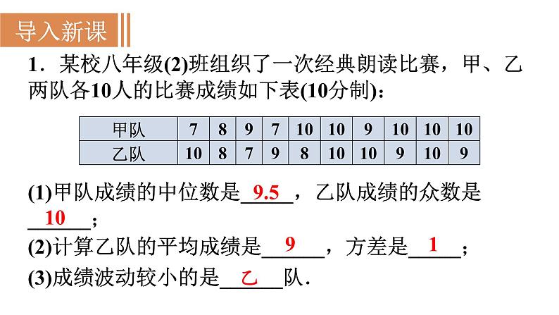 1.某校八年级(2)班组织了一次经典朗读比赛,甲、乙两队各10人的比赛成绩如下表(10分制):