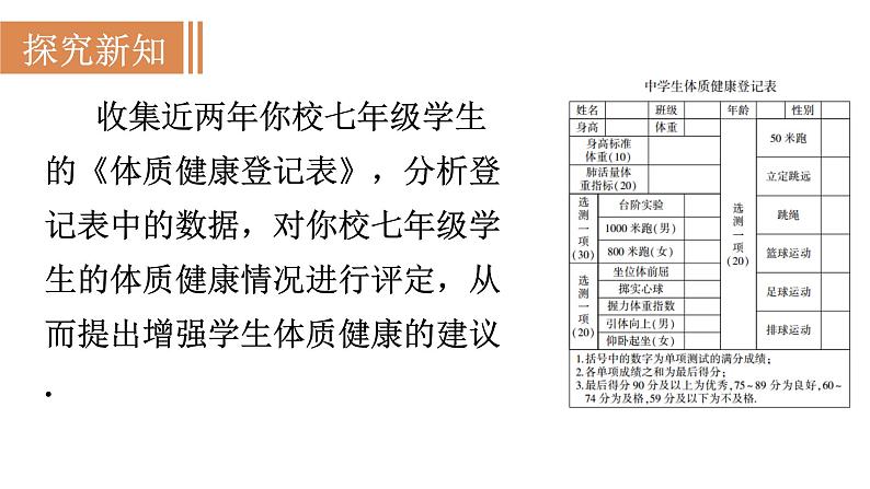 这是一份人教版八年级下册20.3 体质健康测试中的数据分析课文课件ppt,共14页。PPT课件主要包含了体质健康标准登记表,点击表格可编辑,撰写调查报告,数学活动等内容,欢迎下载使用。