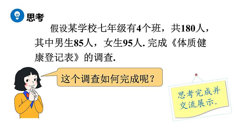 假设某学校七年级有4个班,共180人,其中男生85人,女生95人. 完成《体质健康登记表》的调查.