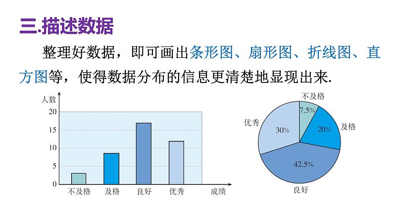 描述数据的方法:利用表格,画出条形图、扇形图、折线图、直方图等,使得数据分布的信息更清楚地显现出来.