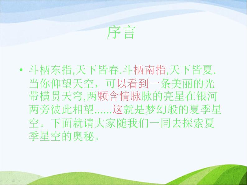 展开斗柄东指,天下皆春.斗柄南指,天下皆夏.当你仰望天空,可以看到一条美丽的光带横贯天穹,两颗含情脉脉的亮星在银河两旁彼此相望……这就是梦幻般的夏季星空。下面就请大家随我们一同去探索夏季星空的奥秘。