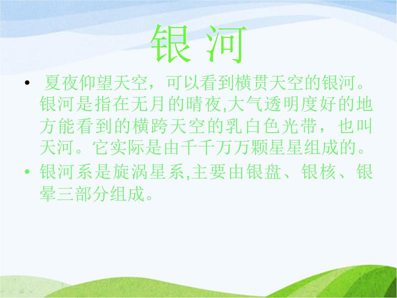 夏夜仰望天空,可以看到横贯天空的银河。银河是指在无月的晴夜,大气透明度好的地方能看到的横跨天空的乳白色光带,也叫天河。它实际是由千千万万颗星星组成的。银河系是旋涡星系,主要由银盘、银核、银晕三部分组成。