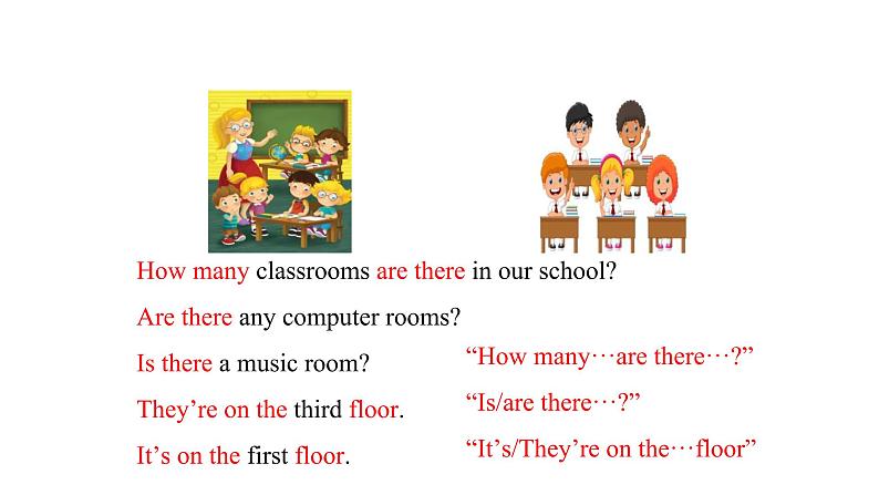 Is there a music rm? Yes, there is./ N, there isn’t.Are there any art rms? Yes, there are. /N, there aren’t.Hw many classrms are there in ur schl?There are 24 classrms.It’s n the first/secnd/third flr.