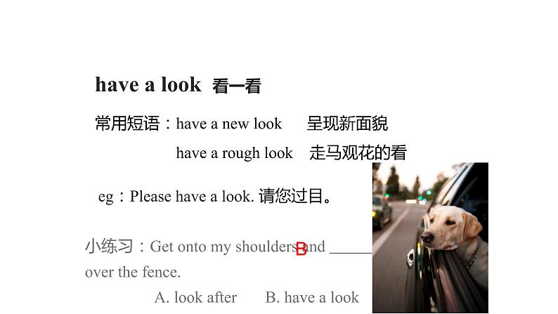 小练习:Get nt my shulders and ver the fence. A. lk after B. have a lk