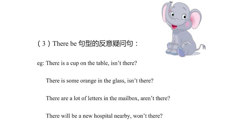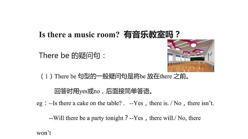 eg:--Is there a cake n the table? --Yes,there is. / N,there isn’t. --Will there be a party tnight?--Yes,there will./ N, there wn’t