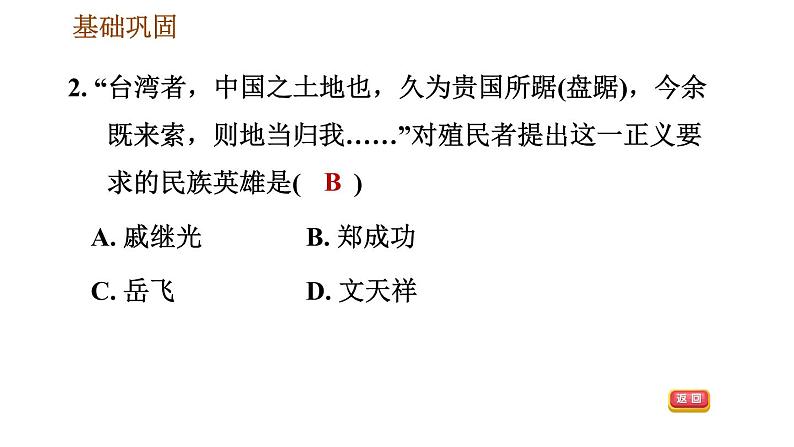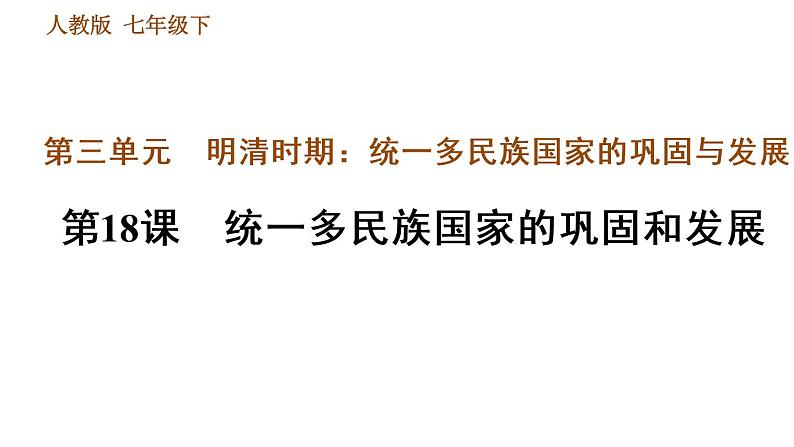 人教部编版七年级下册第18课 统一多民族国家的巩固和发展习题课件ppt: 这是一份人教部编版七年级下册第18课 统一多民族国家的巩固和发展习题课件ppt,共47页。PPT课件主要包含了中央集权,民族英雄,台湾府,达赖喇嘛,康熙帝,驻藏大臣,噶尔丹,小和卓,伊犁将军,渥巴锡等内容,欢迎下载使用。