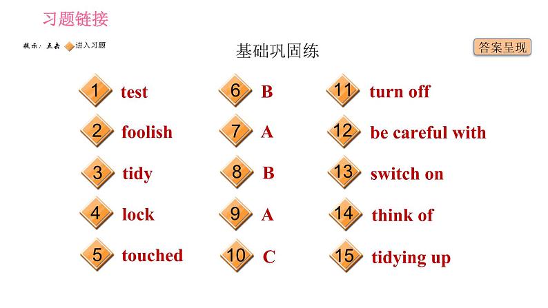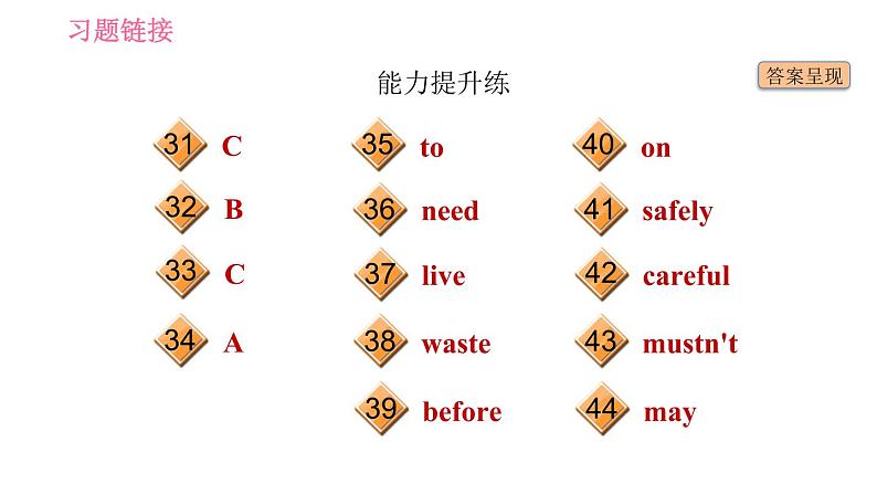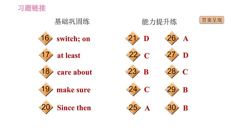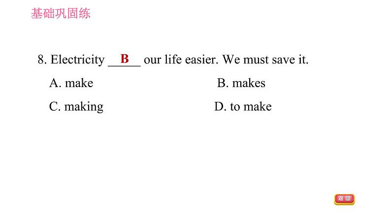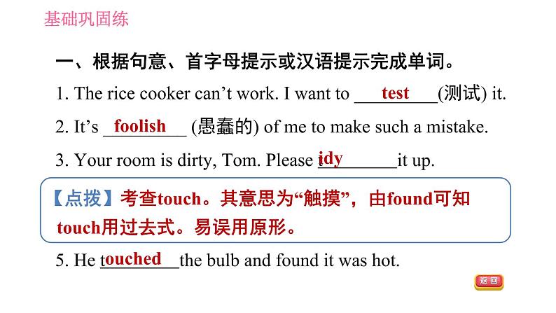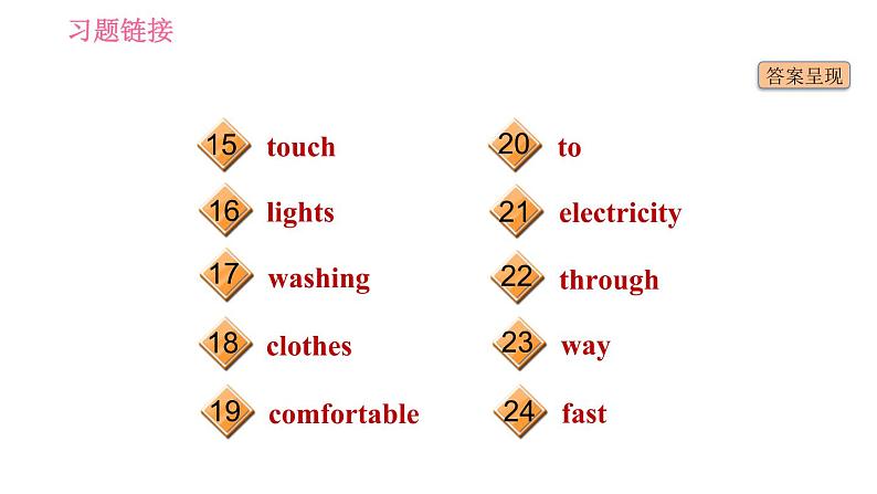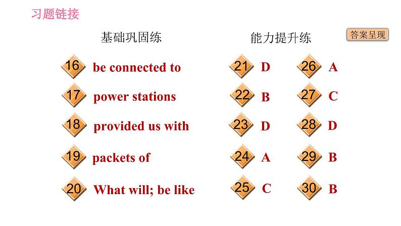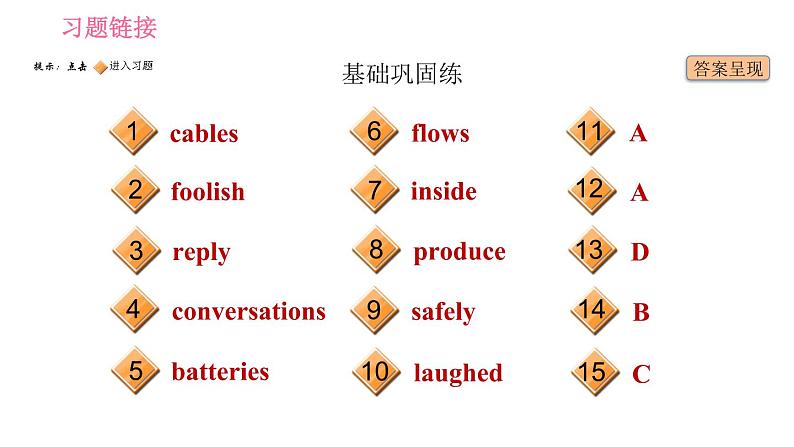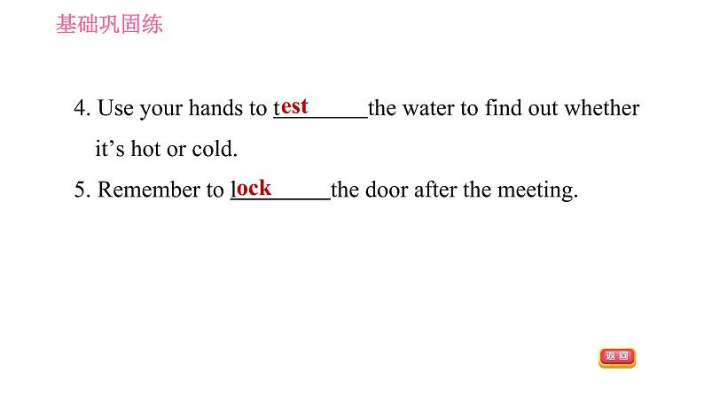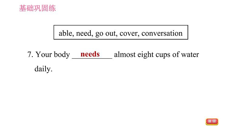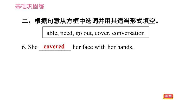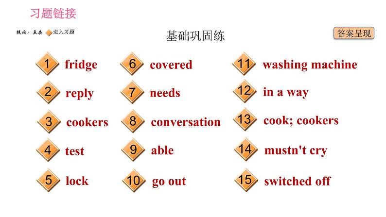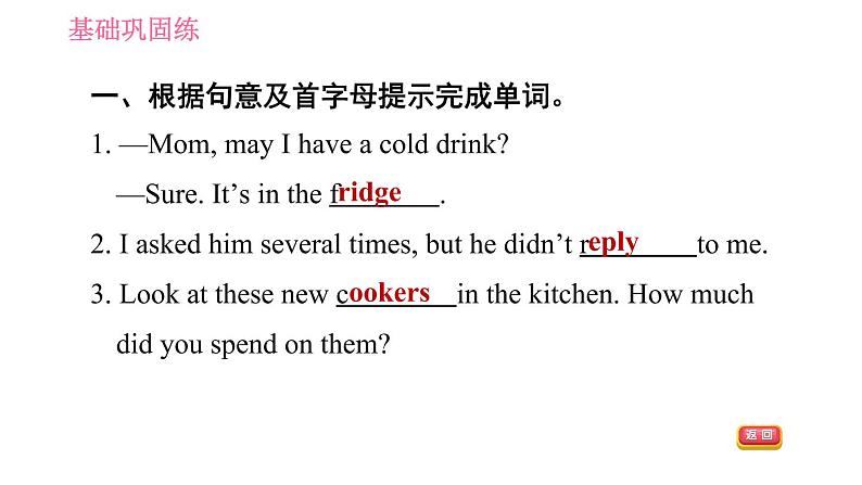 这是一份英语七年级下册(新版)Unit 6 Hard work for a better life习题ppt课件,共21页。PPT课件主要包含了基础巩固练,fridge,reply,cookers,test,lock,covered,needs,able,go out等内容,欢迎下载使用。