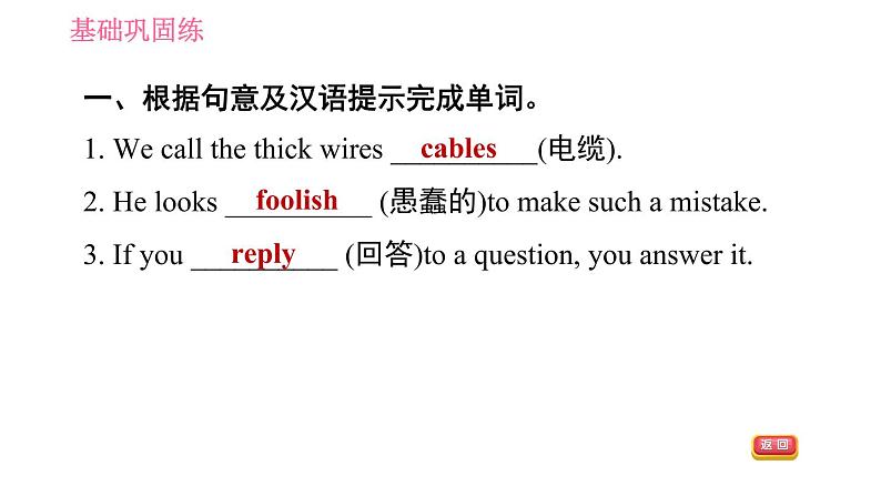 一、根据句意及汉语提示完成单词。1. We call the thick wires __________(电缆). 2. He lks __________ (愚蠢的)t make such a mistake.3. If yu __________ (回答)t a questin, yu answer it.