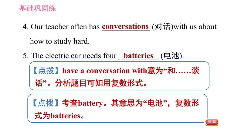 4. Our teacher ften has ____________ (对话)with us abut hw t study hard.5. The electric car needs fur __________ (电池).