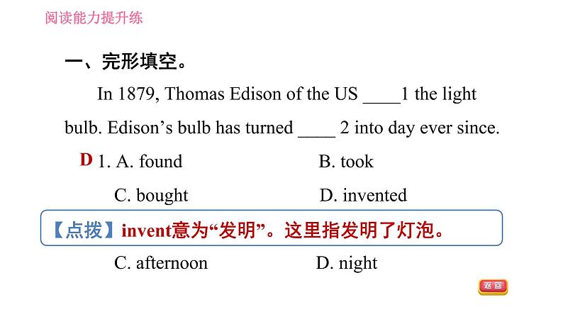 五、完形填空。Yesterday, frm arund 11 a.m. t 7 p.m. all the electricity was ff in Garden City. The lights went _____21. The buses and the undergrund stpped.21. A. in B. n C. up D. ut