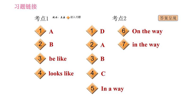 这是一份牛津上海版 (五四制)七年级下册(新版)Unit 6 Hard work for a better life习题ppt课件,共21页。PPT课件主要包含了考点1,考点2,be like,looks like,In a way,On the way,in the way,考点3,考点4,busy等内容,欢迎下载使用。