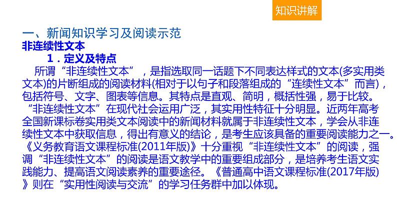 一、新闻知识学习及阅读示范非连续性文本 1.定义及特点 所谓“非连续性文本”,是指选取同一话题下不同表达样式的文本(多实用类文本)的片断组成的阅读材料(相对于以句子和段落组成的“连续性文本”而言),包括符号、文字、图表等信息。其特点是直观、简明,概括性强,易于比较。“非连续性文本”在现代社会运用广泛,其实用性特征十分明显。近两年高考全国新课标卷实用类文本阅读中的新闻材料就属于非连续性文本,学会从非连续性文本中获取信息,得出有意义的结论,是考生应该具备的重要阅读能力之一。《义务教育语文课程标准(2011年版)》十分重视“非连续性文本”的阅读,强调“非连续性文本”的阅读是语文教学中的重要组成部分,是培养考生语文实践能力、提高语文阅读素养的重要途径。《普通高中语文课程标准(2017年版)》则在“实用性阅读与交流”的学习任务群中加以体现。