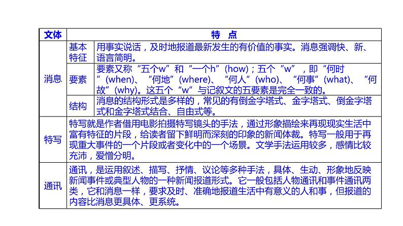二、了解新闻文体特征 (一)新闻的定义 新闻是对新近已经发生和正在发生、或者早已发生却是新近发现的有价值的事实的及时报道。 (二)新闻的分类 新闻有广义、狭义之分。广义的新闻包括消息、通讯、特写、电视新闻等体裁;狭义的新闻专指消息。高考一般选取一些具有时效性、实用性、生活性的新闻特写、消息通讯等,侧重于具有新闻价值和反映精神价值的文章。