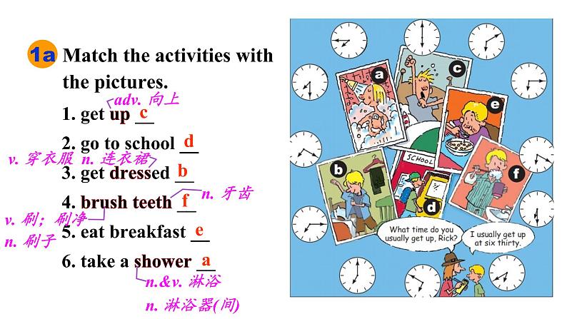 Interviewer: And what time d yu usually get dressed?Rick: I usually get dressed at seven twenty.Interviewer: And my last questin. What time d yu g t schl?Rick: I usually g t schl at seven thirty.Interviewer: Thank yu.