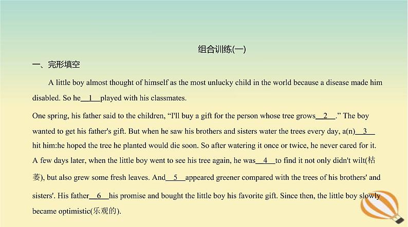 这是一份人教版中考英语题型组合训练八作业课件,共15页。PPT课件主要包含了went to,hole,repair,advice,another,his,stronger,enough,made,About 15%等内容,欢迎下载使用。