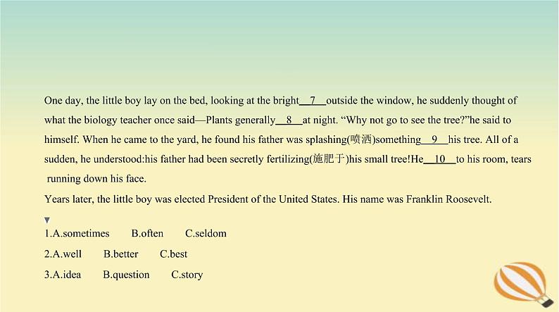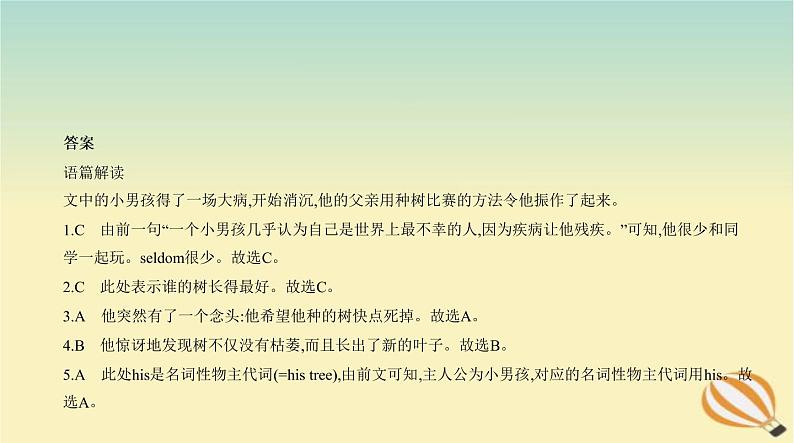 学一起玩。seldm很少。故选C。2.C 此处表示谁的树长得最好。故选C。3.A 他突然有了一个念头:他希望他种的树快点死掉。故选A。4.B 他惊讶地发现树不仅没有枯萎,而且长出了新的叶子。故选B。5.A 此处his是名词性物主代词(=his tree),由前文可知,主人公为小男孩,对应的名词性物主代词用his。故