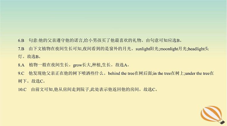 6.B 句意:他的父亲遵守他的诺言,给小男孩买了他最喜欢的礼物。由句意可知应选B。7.B 由下文植物在夜间生长可知,夜间看到的是窗外的月光。sunlight阳光;mnlight月光;headlight头