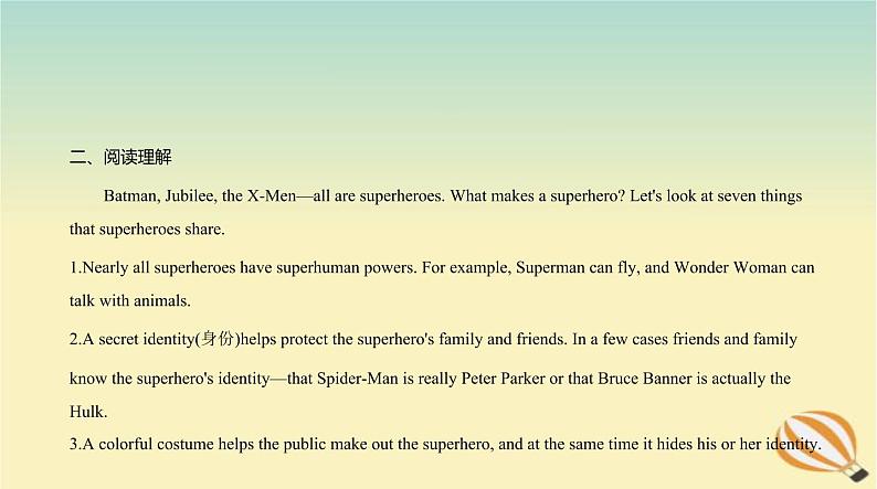 二、阅读理解 Batman, Jubilee, the X-Men—all are superheres. What makes a superher? Let's lk at seven things