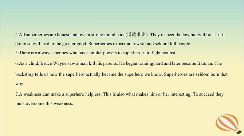 4.All superheres are hnest and wn a strng mral cde(道德准则). They respect the law but will break it if ding s will lead t the greater gd. Superheres expect n reward and seldm kill are always enemies wh have similar pwers t superheres t fight a child, Bruce Wayne saw a man kill his parents. He began training hard and later became Batman. The