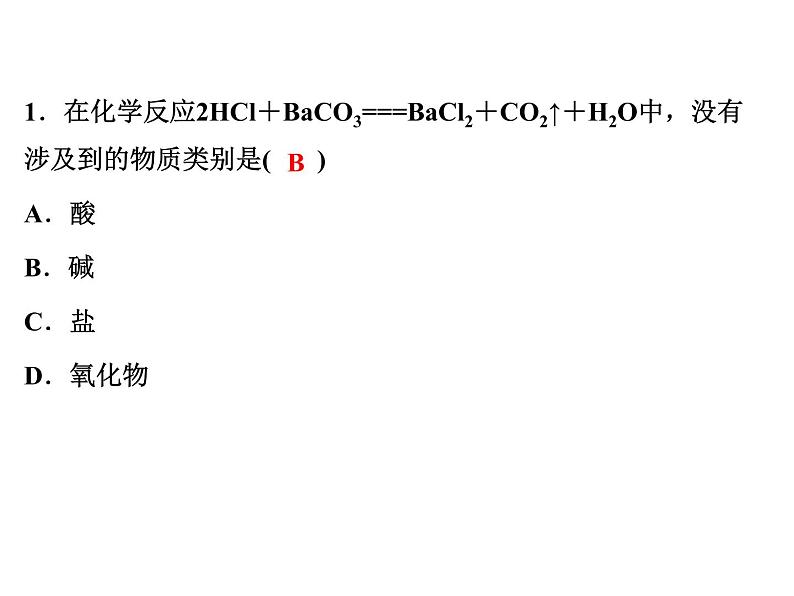 展开1.在化学反应2HCl+BaCO3===BaCl2+CO2↑+H2O中,没有涉及到的物质类别是( )A.酸 B.碱 C.盐 D.氧化物