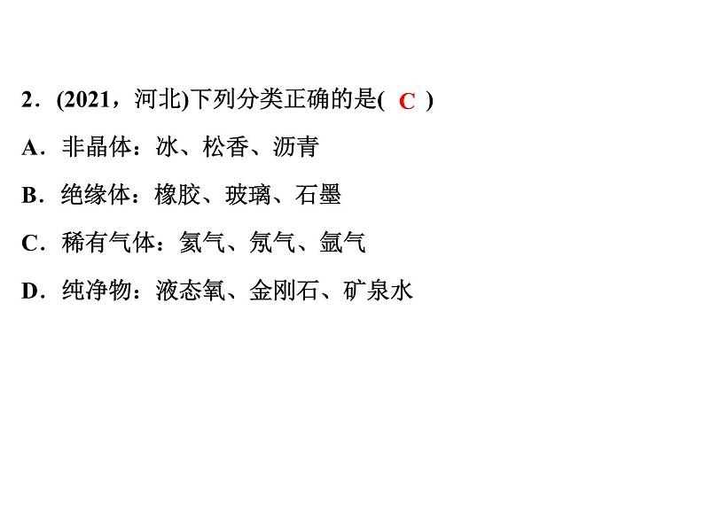 2.(2021,河北)下列分类正确的是( )A.非晶体:冰、松香、沥青B.绝缘体:橡胶、玻璃、石墨C.稀有气体:氦气、氖气、氩气D.纯净物:液态氧、金刚石、矿泉水