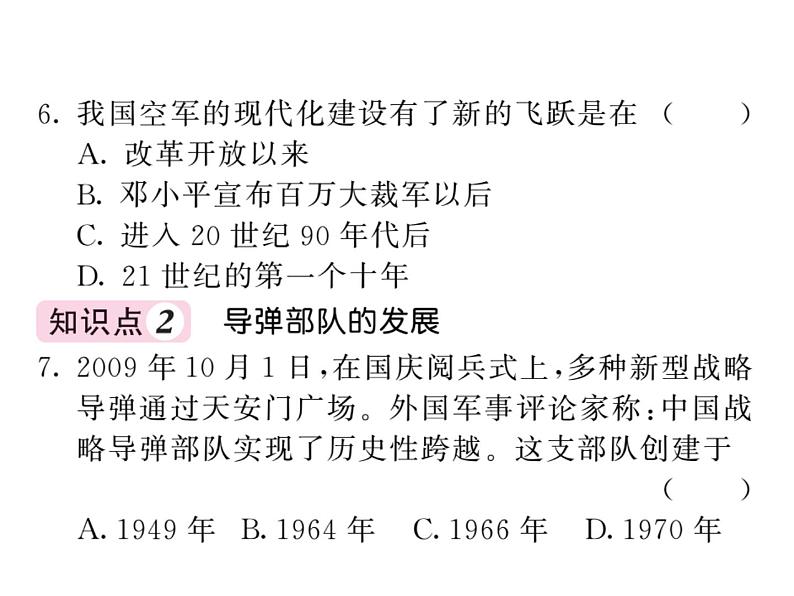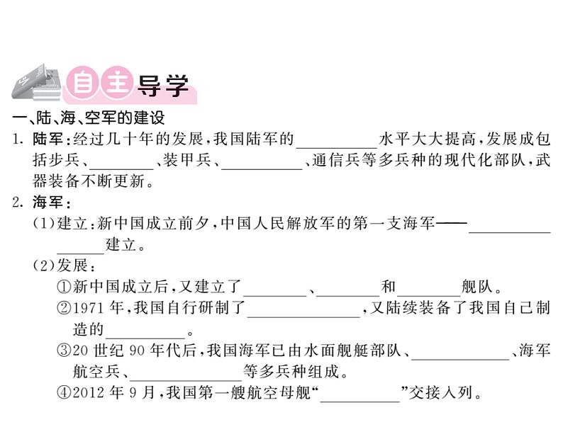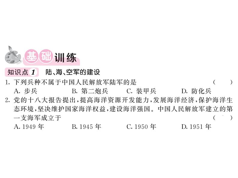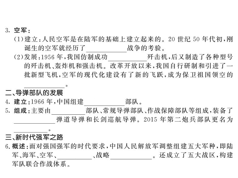 人教部编版八年级下册第五单元 国防建设与外交成就第15课 钢铁长城备课课件ppt: 这是一份人教部编版八年级下册第五单元 国防建设与外交成就第15课 钢铁长城备课课件ppt,共26页。PPT课件主要包含了防化兵,装甲兵,通信兵,陆军兵种,知识拓展,三大海军舰队,歼-5,苏-27,导弹部队的发展,新时代强军之路等内容,欢迎下载使用。