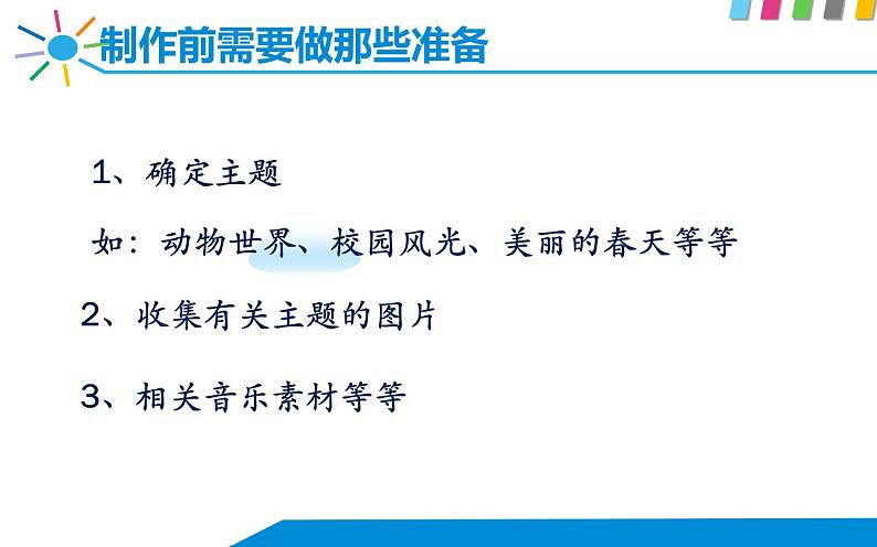 1、确定主题如:动物世界、校园风光、美丽的春天等等