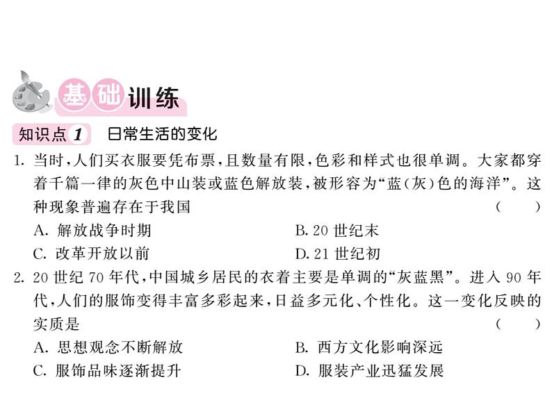 初中历史人教部编版八年级下册第六单元 科技文化与社会生活第19课 社会生活的变迁教学演示课件ppt: 这是一份初中历史人教部编版八年级下册第六单元 科技文化与社会生活第19课 社会生活的变迁教学演示课件ppt,共23页。PPT课件主要包含了“四大件”的变化,20世纪70年代,21世纪,日常生活的变化,服饰的变化,合作探究一,70年代,“蓝灰色的海洋”,文革中的青年,流行的男装等内容,欢迎下载使用。