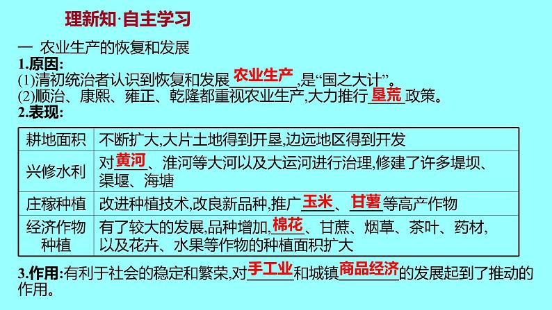 一 农业生产的恢复和发展1.原因:(1)清初统治者认识到恢复和发展_________,是“国之大计”。(2)顺治、康熙、雍正、乾隆都重视农业生产,大力推行_____政策。2.表现:3.作用:有利于社会的稳定和繁荣,对_______和城镇_________的发展起到了推动的作用。