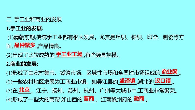 二 手工业和商业的发展1.手工业的发展: (1)清朝前期,传统手工业都有很大发展。尤其是丝织、棉织、印染、制瓷等方面,_________,产品精良。(2)出现了比较成熟的___________,有些颇具规模。2.商业的发展:(1)形成了由农村集市、城镇市场、区域性市场和全国性市场组成的_______。(2)一些农村地区发展为工商业市镇。如吴江县的_______,湖北的_______。(3)在_____、江宁、扬州、苏州、杭州、广州等大城市中,工商业非常繁荣。(4)形成了一些大的商帮,如山西的_____、江南徽州府的_____。
