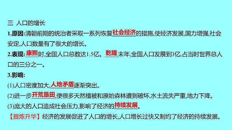 三 人口的增长1.原因:清朝前期的统治者采取一系列恢复_________的措施,使经济发展,国力增强,社会安定,人口数量有了很大的增长。2.表现:_____时,全国人口总数达1.5亿。_____末年,全国人口发展到3亿,占当时世界总人口的三分之一。3.影响:(1)人口密度加大,_________逐渐突出。(2)进一步_________,使很多天然植被和原始森林遭到破坏,水土流失严重,地力下降。(3)庞大的人口造成社会压力,影响了经济的_________。【提炼升华】经济的发展促进了人口的增长,人口增长过快又制约了经济的持续发展。