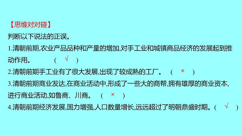 【思维对对碰】判断以下说法的正误。1.清朝前期,农业产品品种和产量的增加,对手工业和城镇商品经济的发展起到推动作用。( )2.清朝前期手工业有了很大发展,出现了较成熟的工厂。( )3.清朝前期商业发达,在商业活动中,形成了一些大的商帮,拥有雄厚的商业资本,进行商业活动,如鲁商、川商。( )4.清朝前期经济发展,国力增强,人口数量增长,远远超过了明朝鼎盛时期。( )