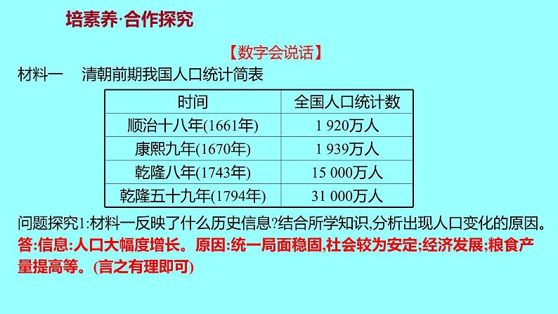 【数字会说话】材料一 清朝前期我国人口统计简表问题探究1:材料一反映了什么历史信息?结合所学知识,分析出现人口变化的原因。答:信息:人口大幅度增长。原因:统一局面稳固,社会较为安定;经济发展;粮食产量提高等。(言之有理即可)
